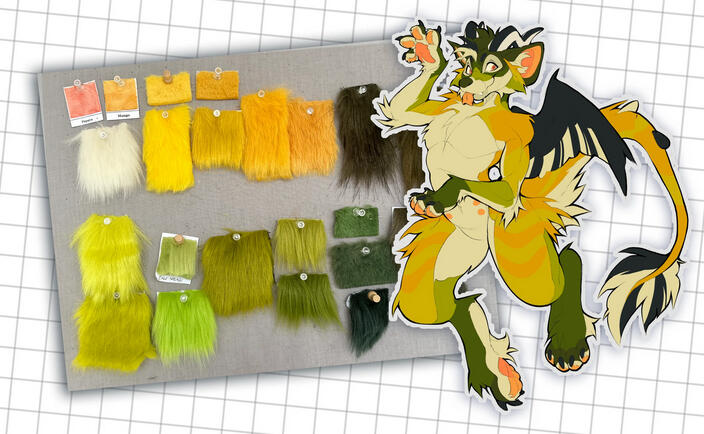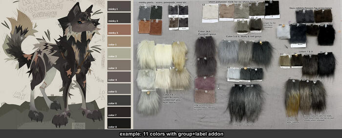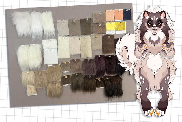 Our colormatching service attempts to find you the closest possible matches to your character's colors. We have a massive global swatch collection (Over 2500 unique swatches!) we can source all kinds of lengths, colors and textures of fur and other fabrics from.We give you a photo of your swatch board (with all the closest matching samples together, sometimes in multiple lighting conditions depending on the tier you get) and color name/supplier list for where to order each one.